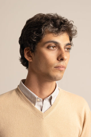 V-Neck Sweater, Natural Vicuña, size L. Model 1.91m.