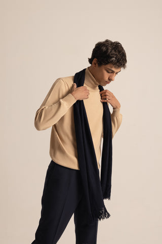 Scarf, Navy Blue, Turtle Neck Sweater, Champagne, size M. Model 1.91m