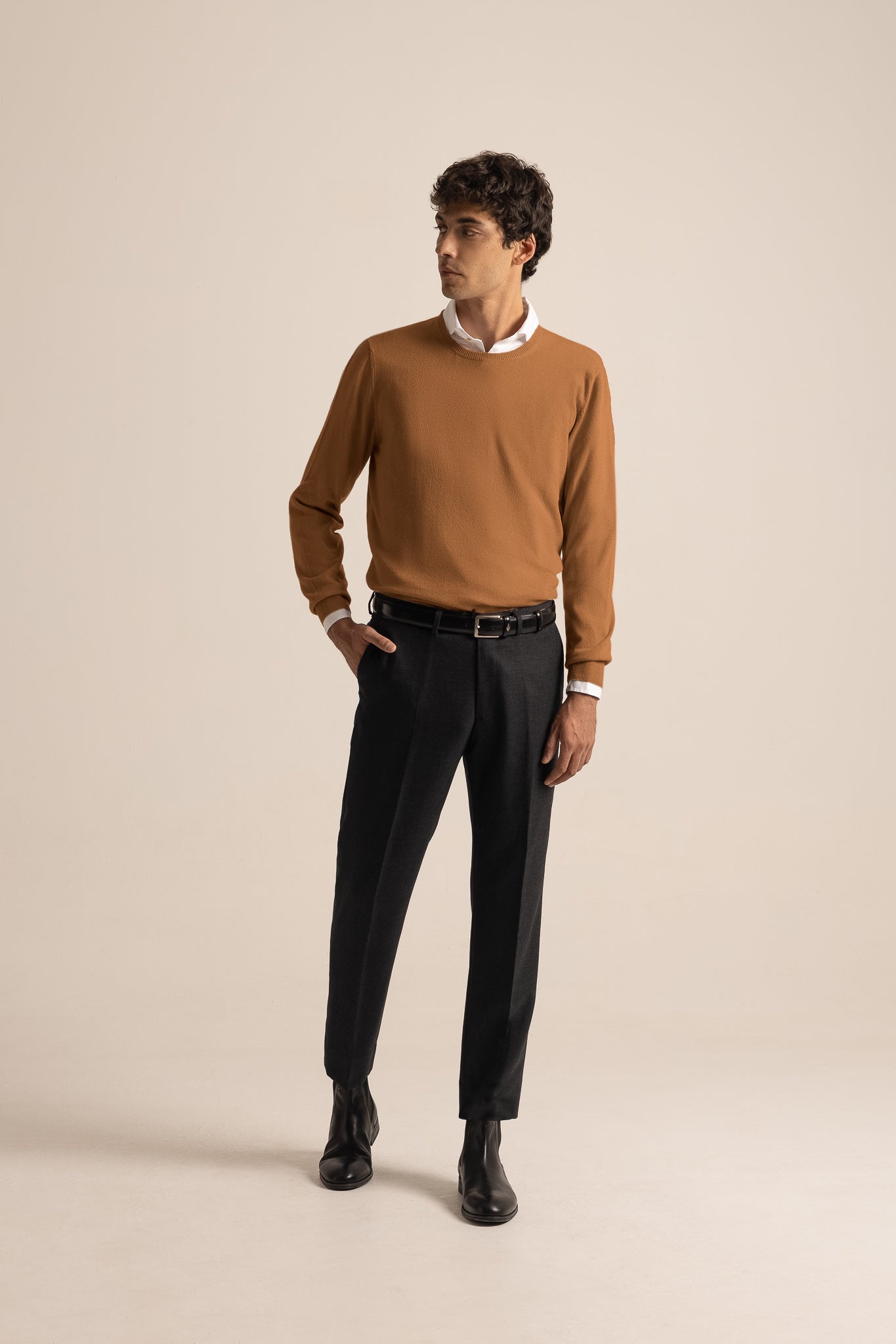 Our Vicuña Crew Neck Sweater is designed with a classic rounded neckline and a modern thin neck trim, making it perfect for layering over a normal t-shirt or  shirt. The slightly fitted silhouette is enhanced by ribbed hems and cuffs for a polished, but timeless look.